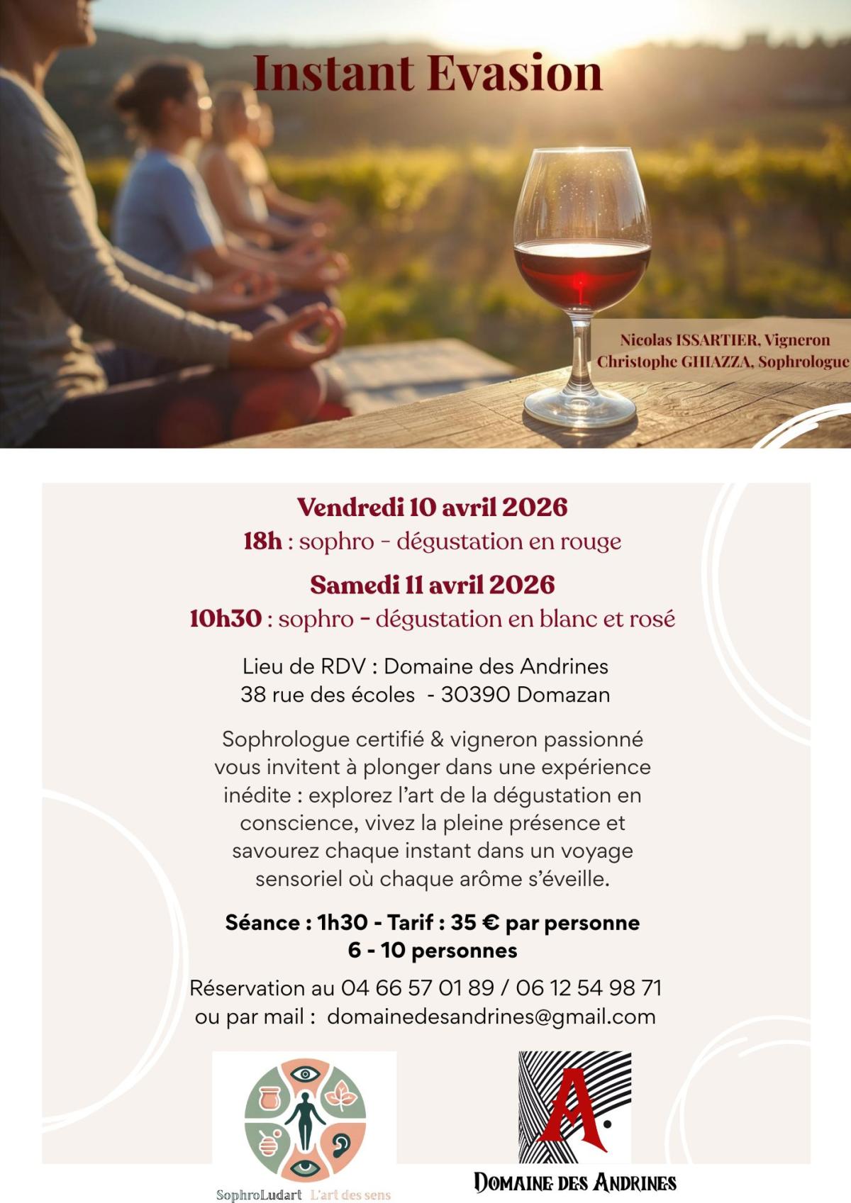 Instant Evasion is the meeting of two worlds: sophrology and wine. Christophe Ghiazza, sophrologist, and Nicolas Issartier, winemaker, join forces for two sessions to offer participants a unique experience.