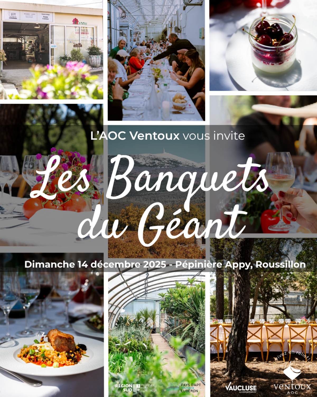 Les Banquets du Géant reviennent pour un dernier rendez-vous gourmand ! Le dimanche 14 décembre, l’AOC Ventoux vous convie à une expérience gustative unique dans le cadre enchanteur de la Pépinière Appy, à Roussillon.