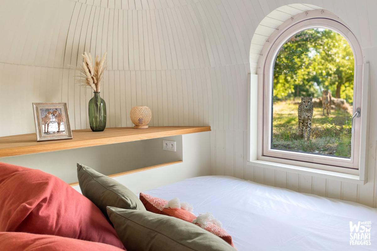Vivez une expérience incroyable en dormant dans l'une des trois huttes, face aux guépards du Wow Safari Peaugres ! Profitez d'une vue panoramique pour observer les félins en toute tranquillité.