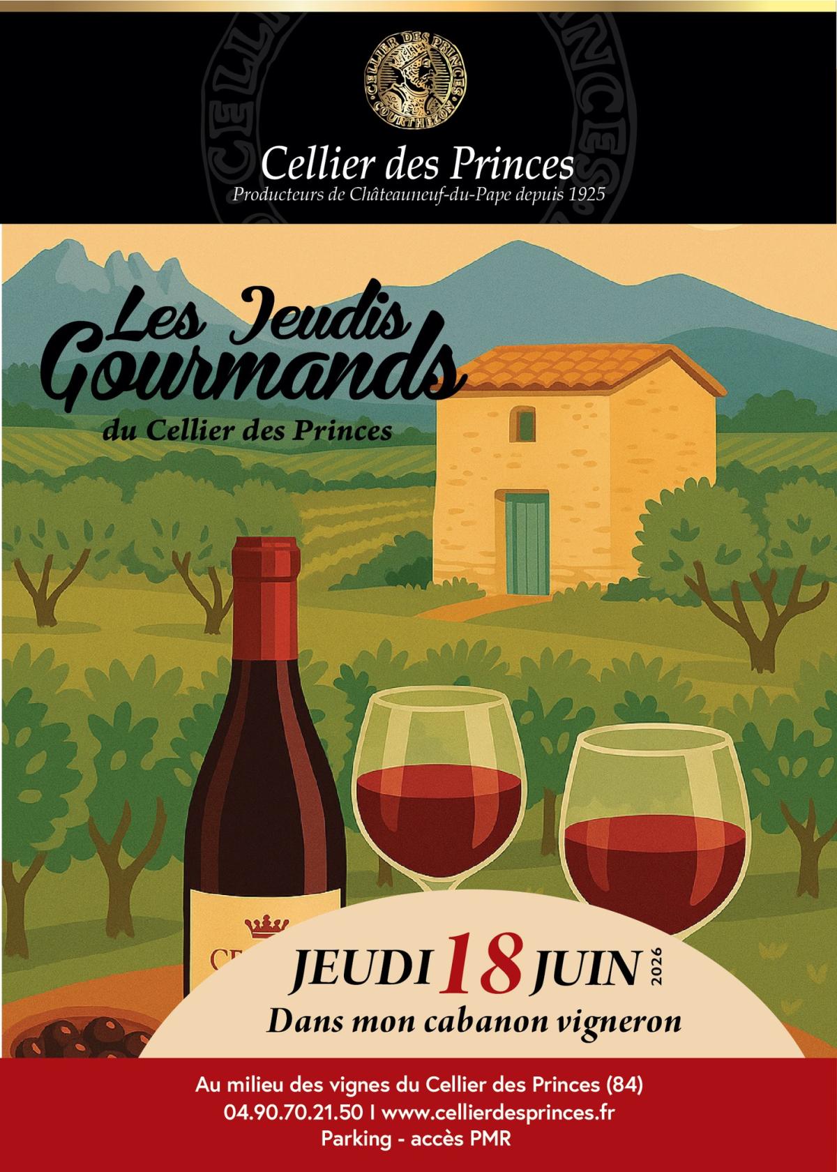 Chaque 3ème Jeudi de chaque mois, vous êtes conviés aux soirées Jeudis Gourmands ! Une parenthèse estivale autour des vins du Cellier des Princes, accompagnée d'une cuisine conviviale et authentique, inspirée des traditions vigneronnes.