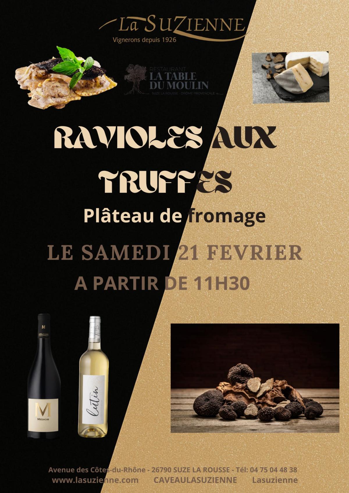 On se retrouve à la cave coopérative de La Suzienne en collaboration avec la table du moulin pour vous proposer un moment gourmand et convivial autour de ravioles aux truffes accompagnées d'un plateau de fromages.