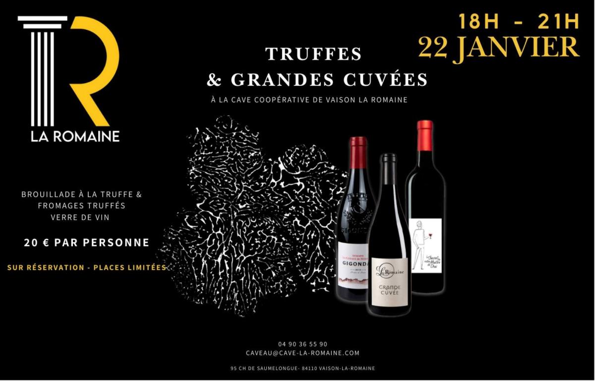 La Cave Coopérative de Vaison-la-Romaine vous invite dans une ambiance conviviale et chaleureuse à une soirée gourmande autour de la truffe entre brouillade, fromages et vins. Places limitées. Sur réservation.